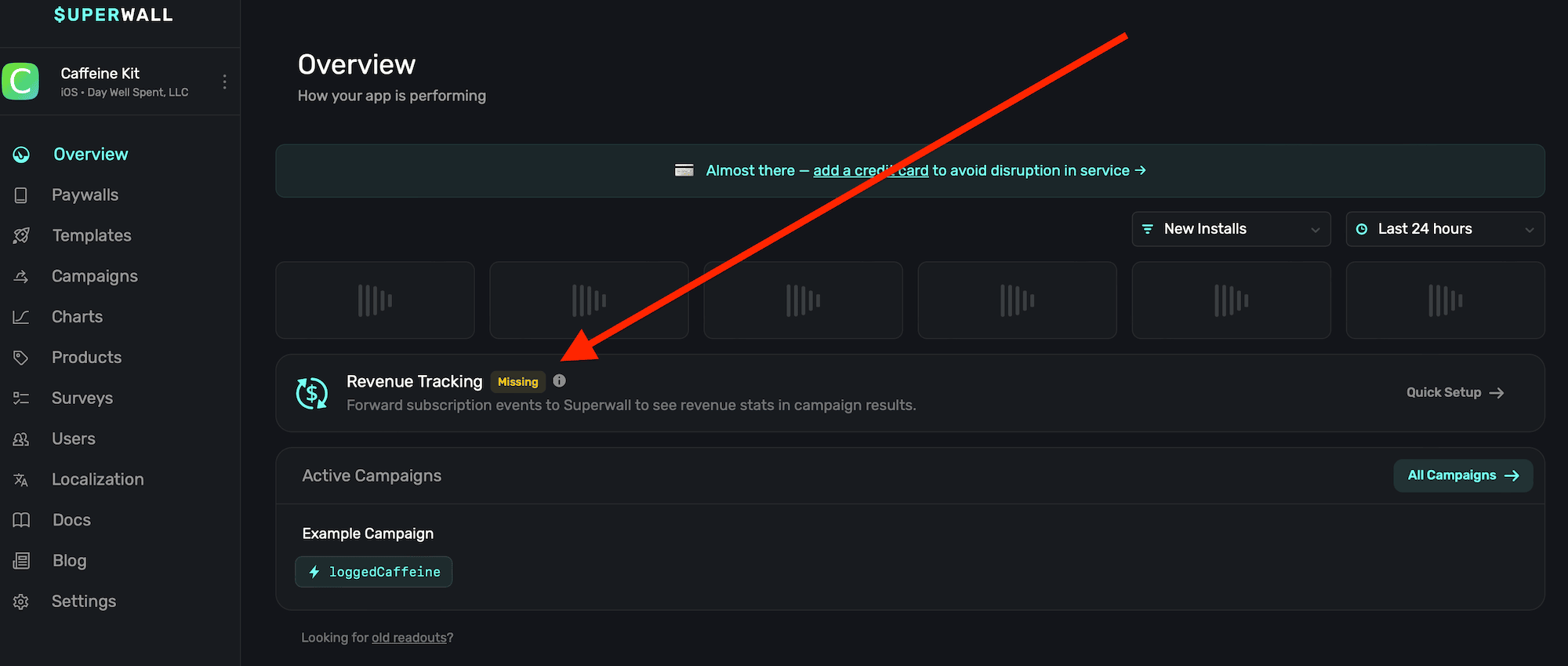 If you don't have revenue tracking setup, you will see a banner on your dashboard: