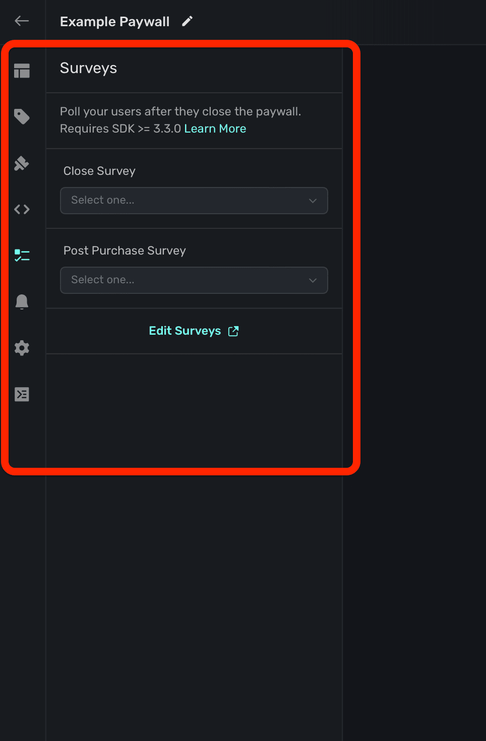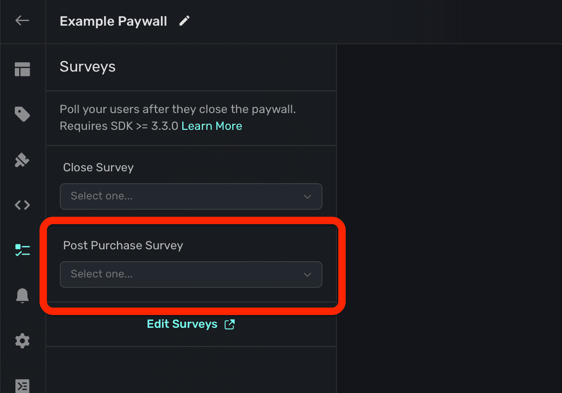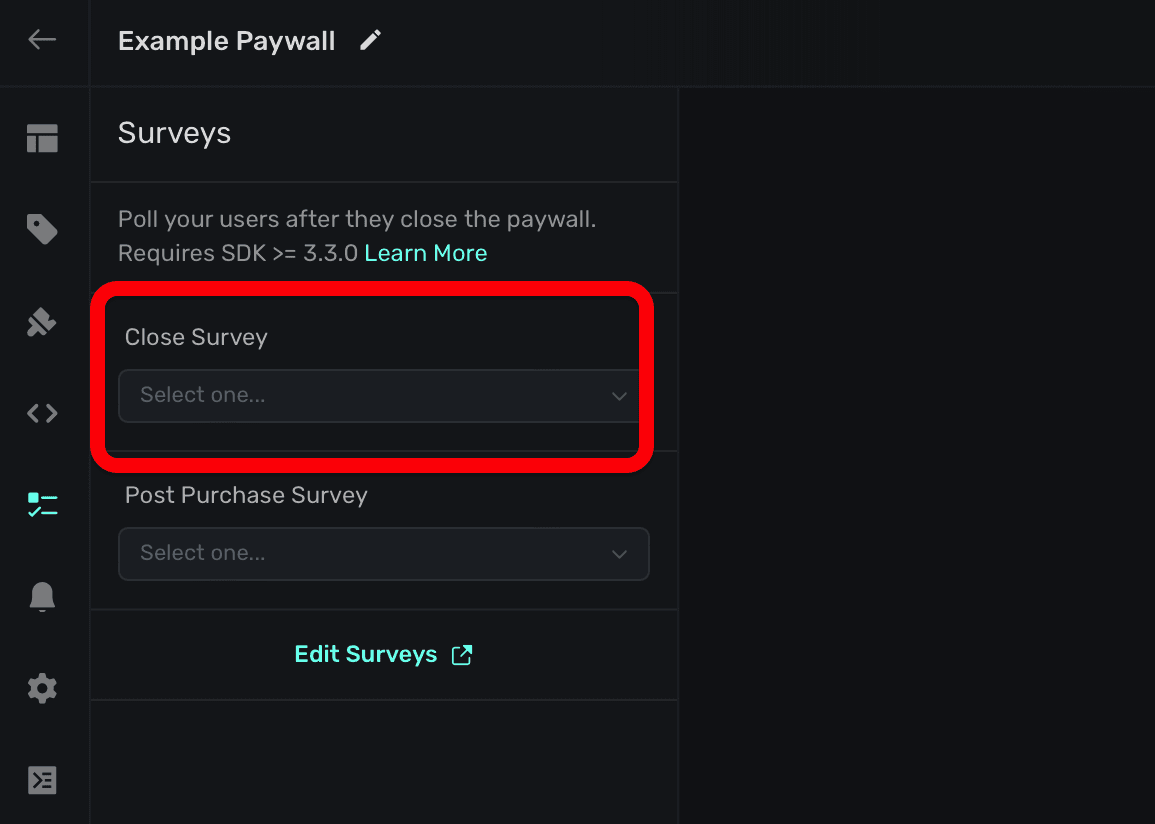 To set up a survey to show users when they close a paywall or perform a purchase, click the Surveys button from the sidebar: